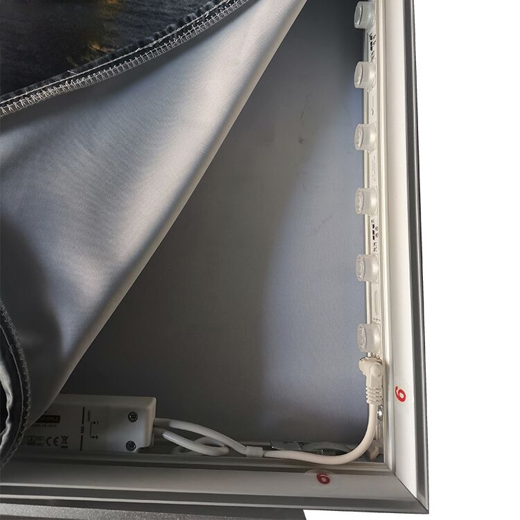 The fabric graphic is inserted into the lightbox with a thin silicone strip, which is sewn on the edge of the pattern and neatly installed in a small channel around the extrusion of the aluminum frame to form a frameless look. The result is a drum-shaped, compact fabric pattern that illuminates evenly from the back. Moreover, the fabrics are flame retardant, scratch-resistant and washable, which are very suitable for indoor environments, because they have the least light reflection.